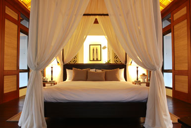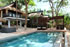 テラスからプールへアクセスするプールヴィラは、カート道を進みスイミングプールを通り過ぎ木々に包まれた道沿いに現われる落ち着いたヴィラです。